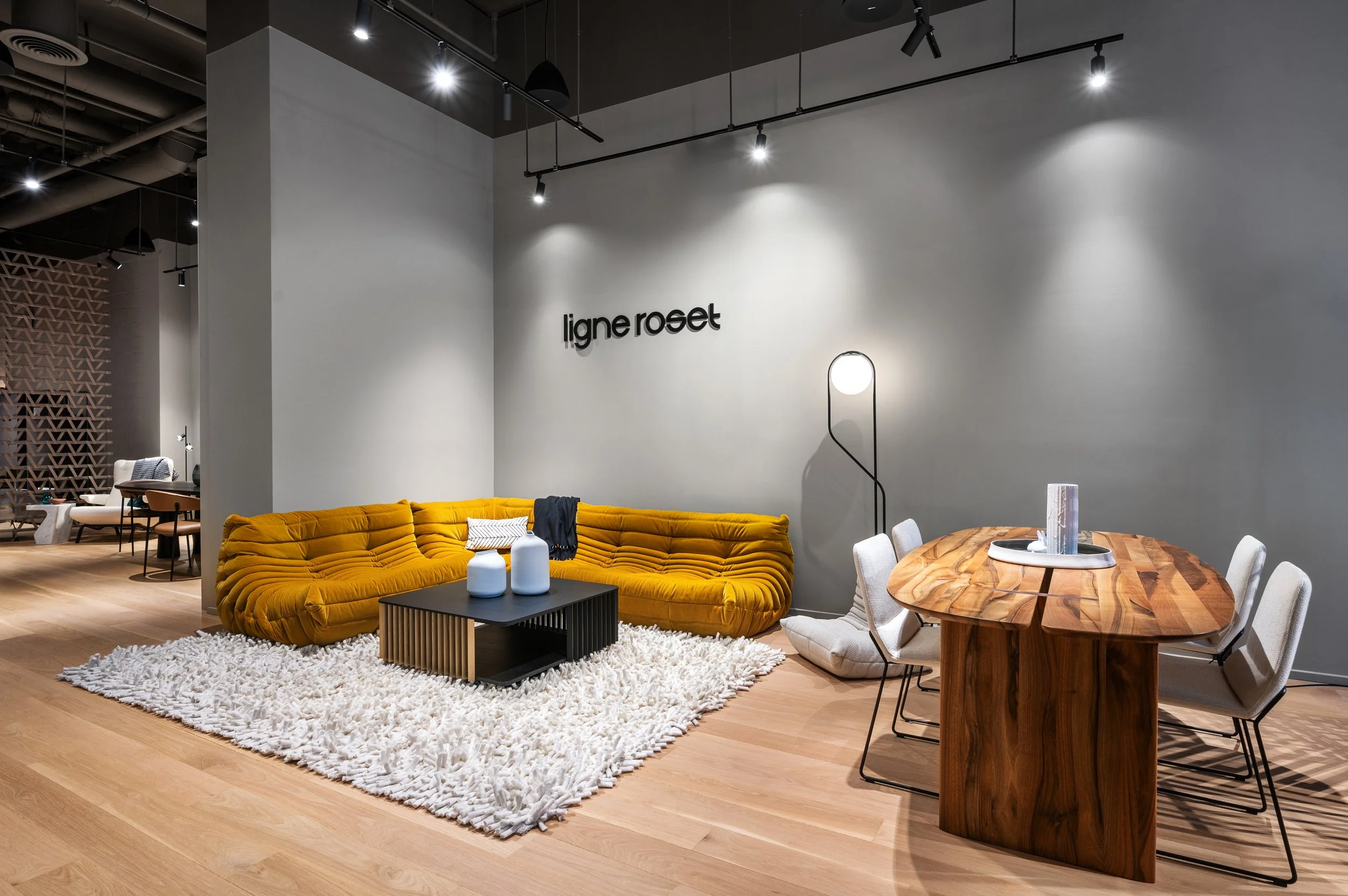 The East 57th Street showroom of Ligne Roset, the historic French furniture house, conceieved as both a temporary home and a deliberate counterpoint to the Park Avenue landmark.