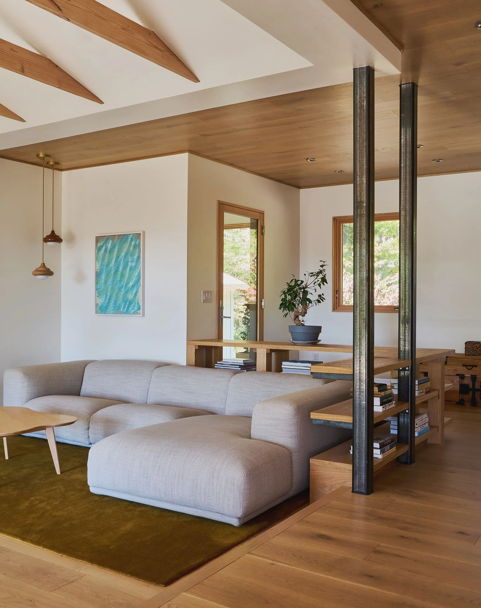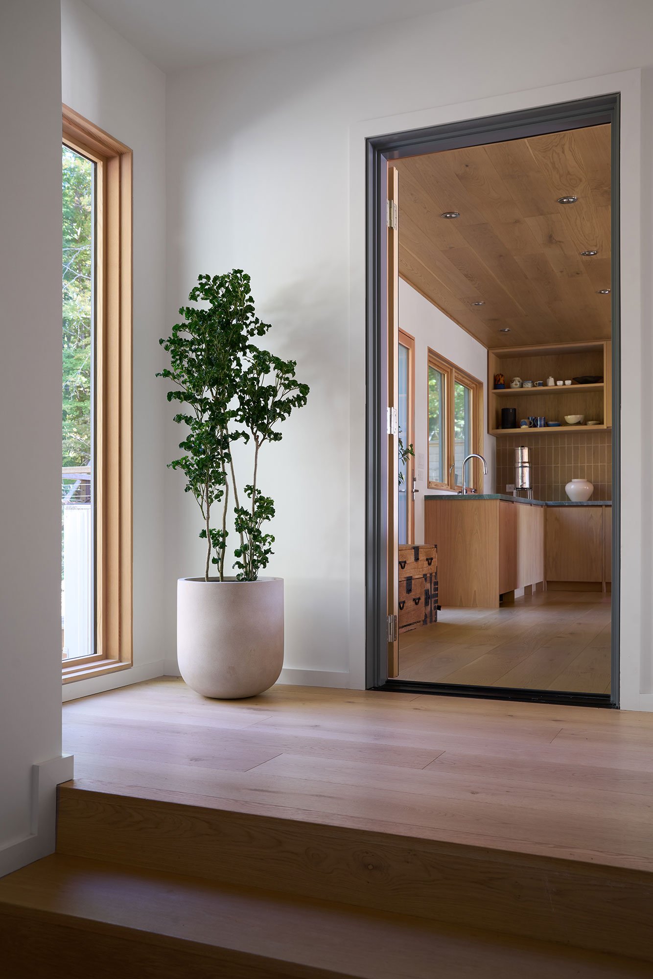 White oak warms the interiors, flowing underfoot as floors and then overhead in the kitchen and dining areas, where it creates an intimate, cozy and space-defining cocoon. This gesture defines the gathering spaces while contrasting with the living room's high white ceiling, where light and volume take center stage.