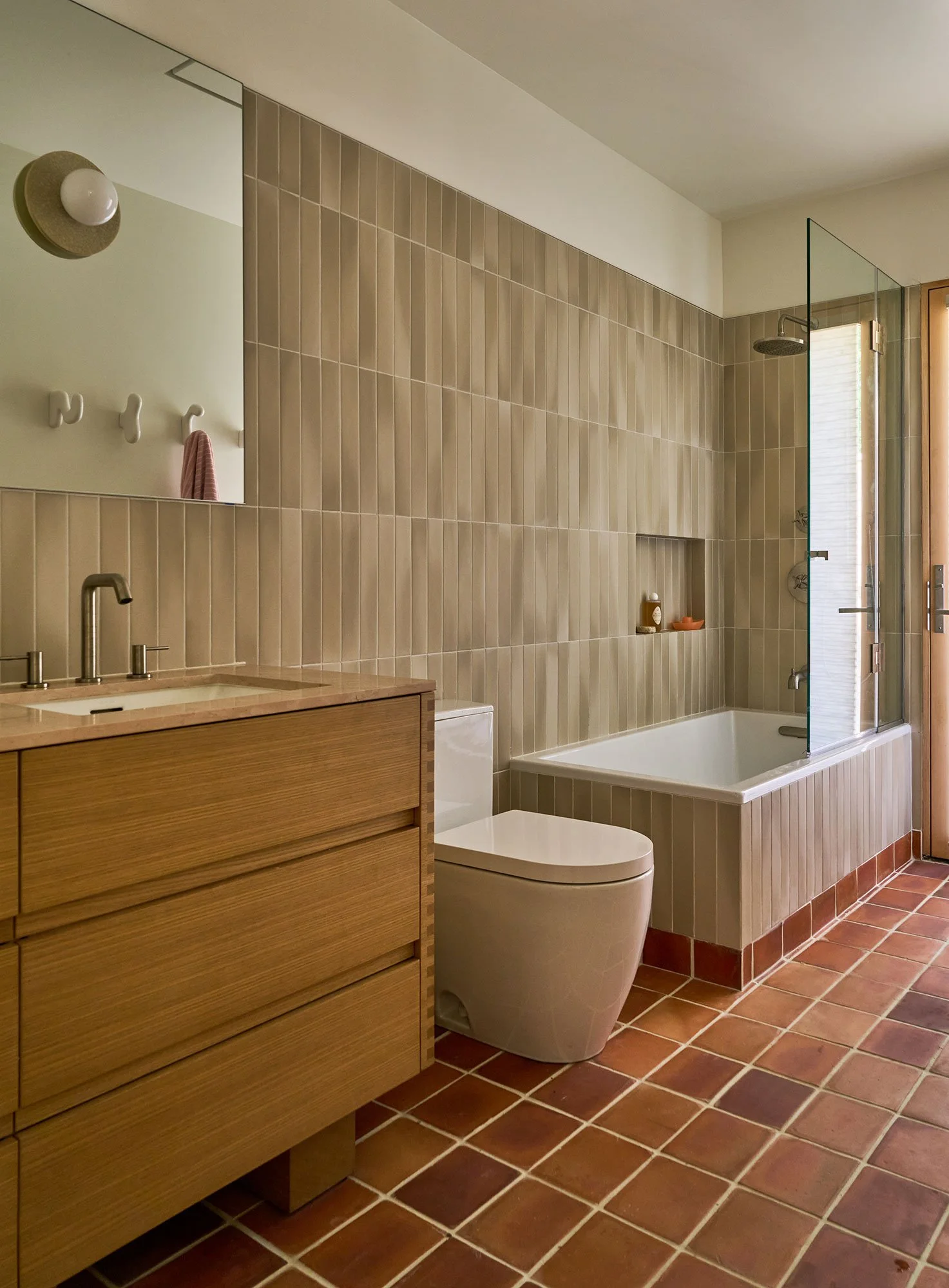 In the kitchen the centerpiece is an emerald green quartzite slab. Its green veins catch and reflect the lush landscape beyond, enhancing the feeling of living in nature.